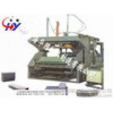 靜停養護達到切割強度后,模框由翻轉行車吊運至切割機工位上,翻轉吊具將??蚍D90°放在切割小車支座上,然后由翻轉吊具機械手自動開啟??颉⒚撃?,把坯體連同側板側立在第一輛切割小車上,脫下的??蚯謇砗笈c蒸養返回的經清理噴油后的側板組合成模具,等待澆注。在組模的同時,脫模后的坯體在切割機上分部做定點切割,首先第一輛切割小車帶動坯體行走經過縱切裝置進行縱向切割,坯體在進行縱向切割時,分別由切割刀片和由汽缸張緊的切割鋼絲同時完成側面、面包頭及頂面廢料的切割與清理,縱切結束后,切割小車繼續行走至橫切裝置中央位置停止,橫切架自上而下垂直降落進行坯體的橫向切割,橫切時切割鋼絲作鋸裝擺動,完成坯體的鋸裝橫向切割。坯體切割完成后,人工推鏟出去頂部面包頭。小車置換裝置啟動,由切割機下方小車置換油缸將切割好的坯體連同側板頂起,下方第一輛小車返回起始位置,去承載新的帶切割的坯體,第二輛小車替換第一輛小車位置,并承載坯體及側板行走至預定位置,最后坯體由半成品吊車連同地板吊運至釜前蒸養小車上,在軌道上進行編組。