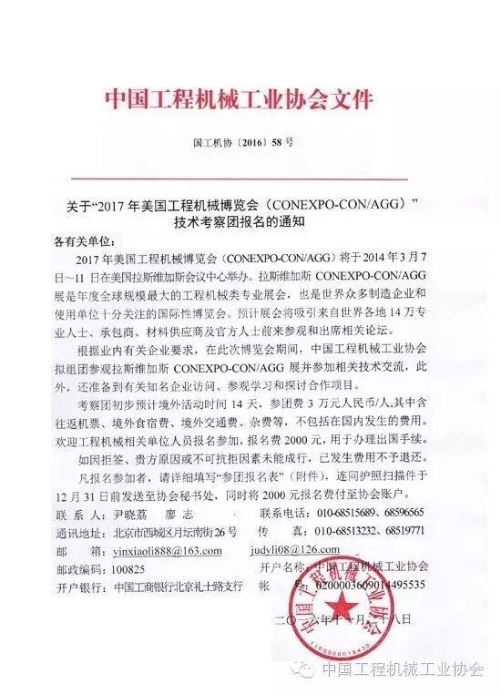 根據業內有關企業要求,在此次博覽會期間,中國工程機械工業協會擬組團參觀拉斯維加斯CONEXPO-CON/AGG展并參加相關技術交流,此外,還準備到有關知名企業訪問、參觀學習和探討合作項目。