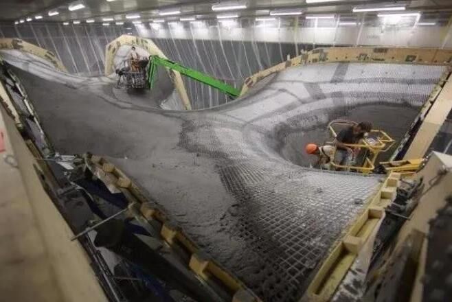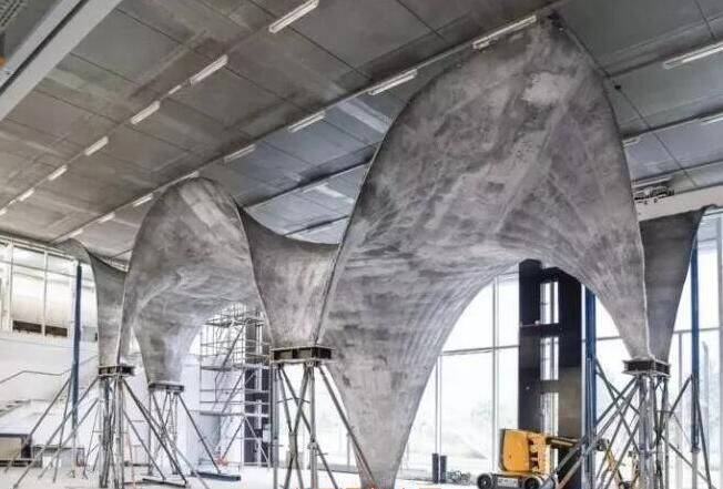 據了解,工程師們在打造過程中并沒有采用定制、一次性的木頭或泡沫支架,而是使用了他們自己設計的一種新技術。一張鋼索網被拉伸到想要的形狀,然后再在上面放置聚合織物形成一個靈活的模板。之后形狀可以通過算法控制,它能將力均勻地發布在各鋼索間并決定每個部分所需要的混凝土量。之后,鋼索網可以被拆掉、重復使用和重新調整。