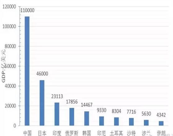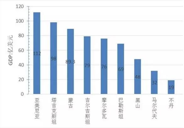 從經濟總量看,GDP超過1萬億美元的國家5個,分別為中國、日本、印度、俄羅斯、韓國,其中中國經濟總量為11萬億美元、位居第一、為最小國家不丹的5800倍,約占“一帶一路”地區經濟總量的40%;GDP在5000億到1萬美元的國家4個,分別是印尼、土耳其、沙特、波蘭;GDP在1000億到5000億美元的國家19個,GDP在100億到1000億美元的國家30個;低于100億元美元的國家8個,分別為塔吉克斯坦、蒙古、吉爾吉斯坦、摩爾多瓦、巴勒斯坦、黑山、馬爾代夫、不丹,其中經濟規模最小為不丹、GDP為19億美元。