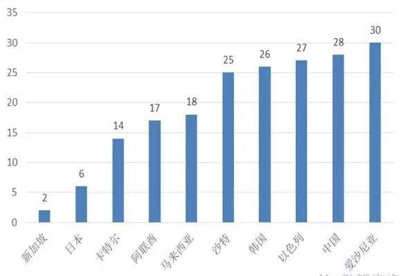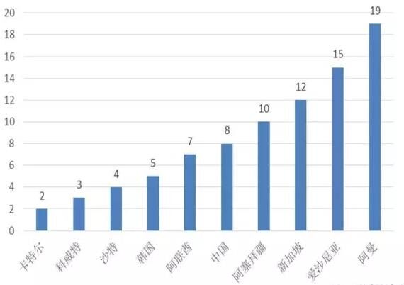 世界經濟論壇發布的《2015-2016全球競爭力報告》,用法律和行政架構、基礎設施、宏觀經濟環境、衛生和基礎教育、高等教育和培訓、市場效率、勞動力市場效率、金融市場發展、技術、市場規模、商業環境完備性、創新12個指標對全球140個國家和地區的競爭力進行了評估,并對12個指標賦值加權后,得出各國的綜合競爭力排名。“一帶一路”沿線66個國家中,有53個國家的競爭力數據在此報告中體現(詳見附表2)。排名位于前70名(140個國家,70名為世界平均水平)的國家有35個,其中新加坡、日本、卡特爾、阿聯酋、馬來西亞、沙特、韓國、以色列、中國、愛沙尼亞的排名在“一帶一路”沿線國家中位于前10名,在全球的排名分別為第2名、第6名、第14名、第17名、第18名、第25名、第26名、第27、第28名、第30名;中國排名靠前的主要因是宏觀經濟環境良好、市場規模大,其余10個指標排名均在30名以后;位于后70名的國家31個,其中阿爾巴尼亞、塞爾維亞、尼泊爾、黎巴嫩、不丹、孟加拉國、波黑、埃及、巴基斯坦、緬甸的排名在“一帶一路”沿線國家中位于后10名,在全球的排名分別為第93名、第94名、第100名、第101名、第105名、第107名、第111名、第116名、第126名、第131名。總體上看,“一帶一路”沿線國家競爭力在全球排名分布比較靠后,整體競爭力能力有待提升。