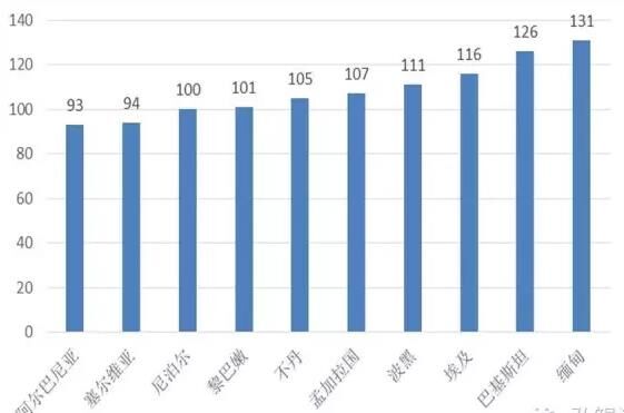 圖6“一帶一路”地區競爭力排名前十、后十的國家及其在全球中的排名