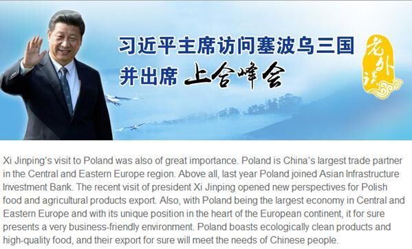 習近平對波蘭的訪問同樣意義大重大。波蘭是中國在中東歐地區的最大貿易伙伴。去年,波蘭也加入了亞洲基礎設施投資銀行。習主席的這次訪問將為波蘭的食品和農產品出口開拓新的局面。此外,波蘭是中東歐最大的經濟體而且位于歐洲心臟地帶,它一定能提供非常有利的經商環境。波蘭還提供生態潔凈的產品和高質量的食品,它們的出口肯定會滿足中國人民的需要。